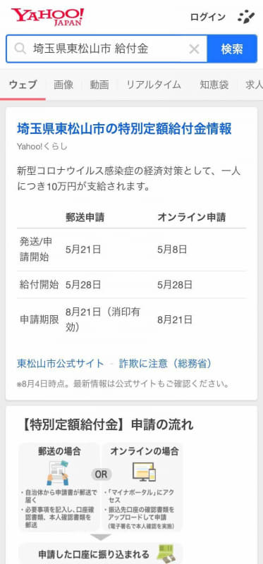 10万円給付金、給付開始日はいつ? Yahoo!検索で自治体ごとに表示