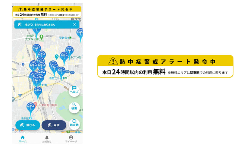 熱中症アラートで日傘を1日無料レンタル。アイカサ