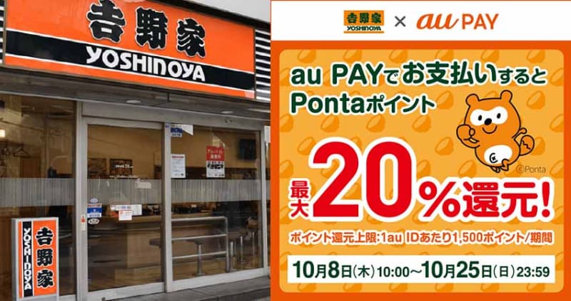 吉野家、au PAY対応開始。Ponta 20%還元も