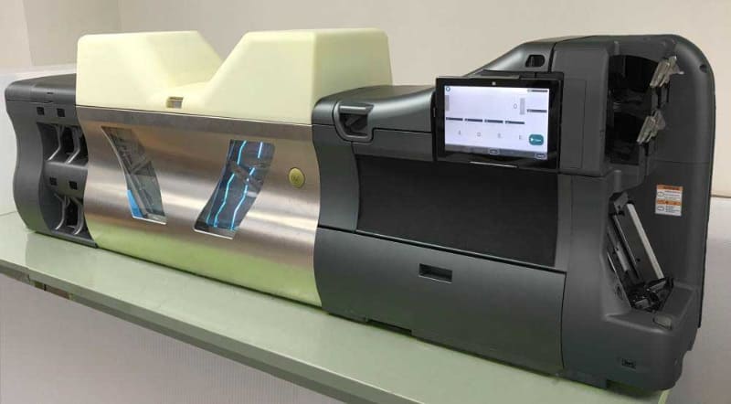 紙幣を1枚ずつ除菌できる「紙幣除菌装置」。日立オムロン