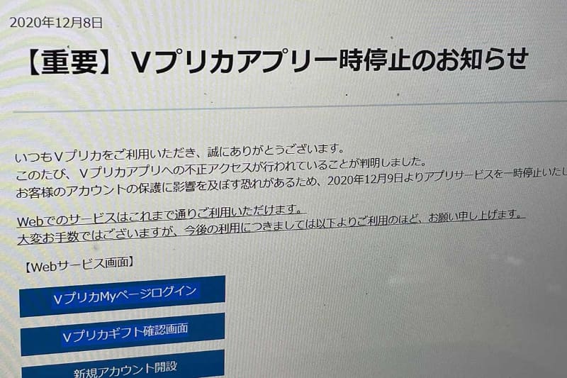 Vプリカ、不正アクセスでアプリサービスを一時停止