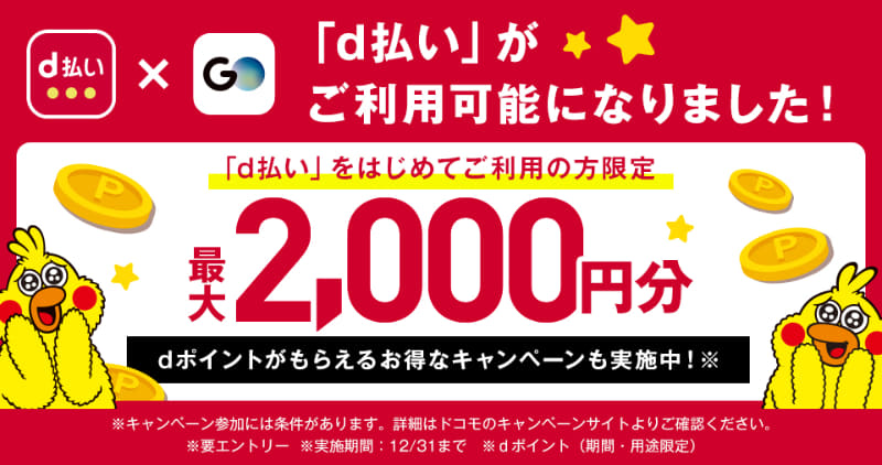 タクシーアプリ「GO」、d払い利用で500ポイント還元