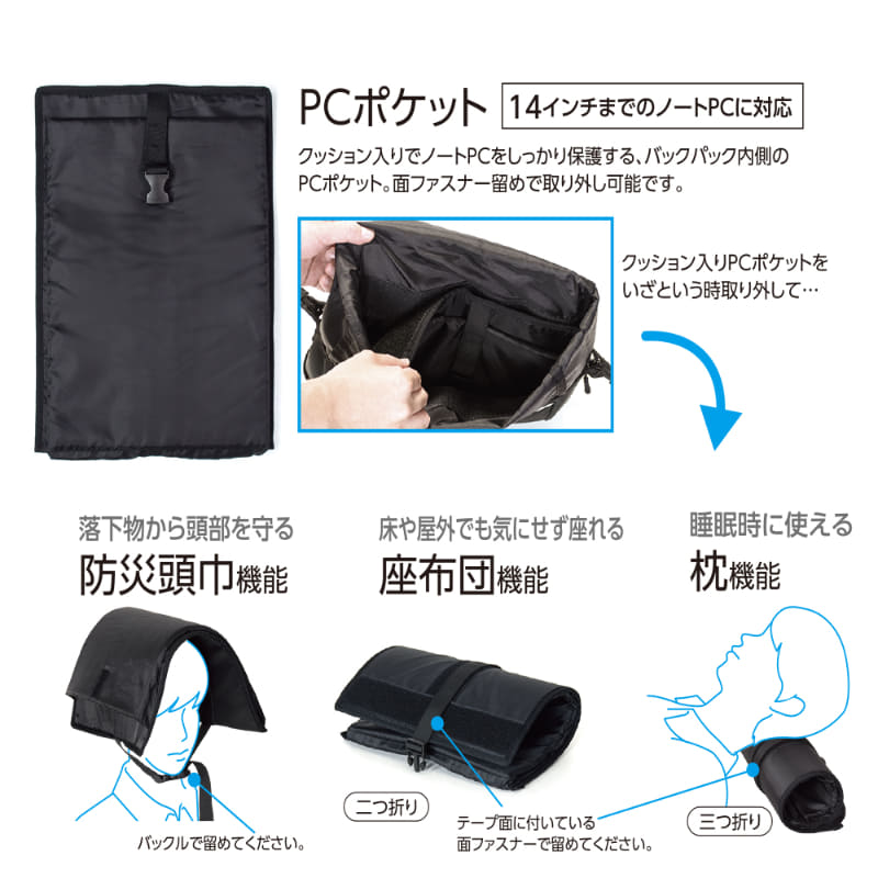 ナカバヤシ、防災頭巾や枕になる防災PCバッグ。7つの機能