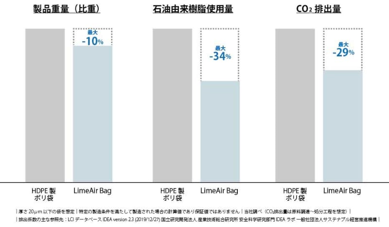 石灰石を25%含むポリ袋「LimeAir Bag」。CO2を29%削減