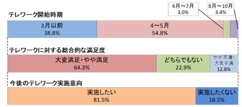 テレワーカー倍増、6割が満足。労働時間は増えた人より減った人が多い(4/9)