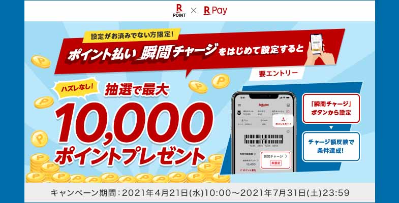 楽天ペイ、「ポイント払い瞬間チャージ」の新規設定で最大1万ポイント