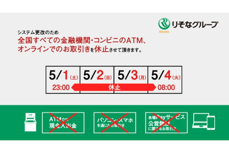 りそな、5月1~4日にサービス停止。ATM出金も不可