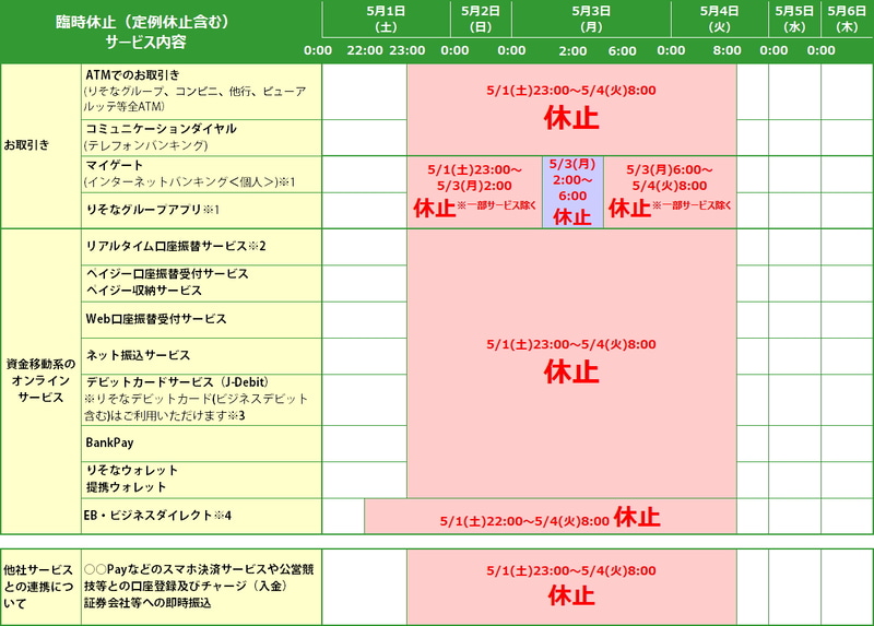 りそな、5月1~4日にサービス停止。ATM出金も不可