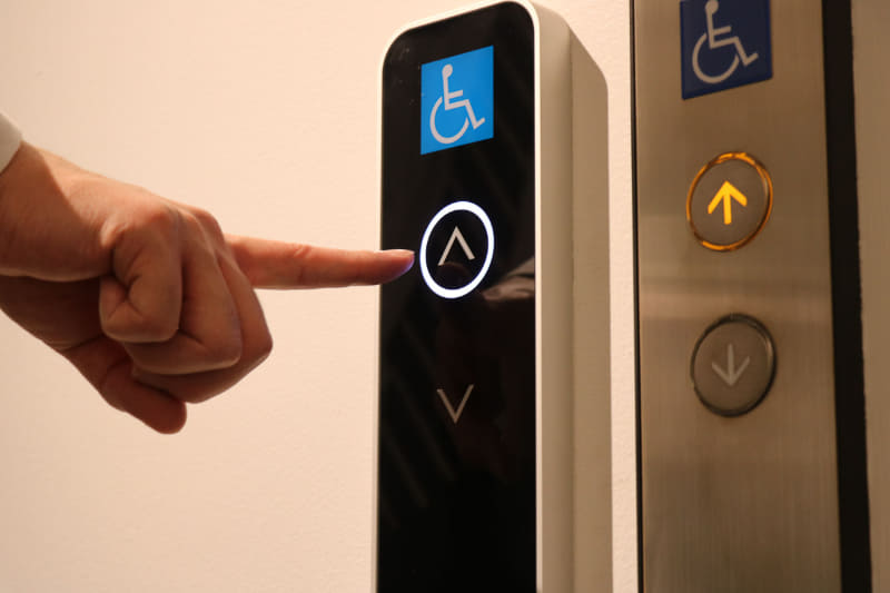 日立の非接触ボタンエレベーター、「ナノイー X」でかご内をクリーンに