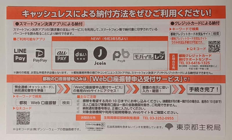 東京都の納税、d払い・au PAY対応。自動車税種別割など