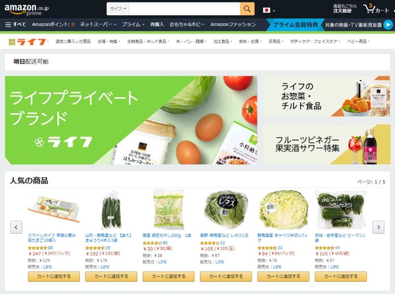 Amazonとライフの生鮮食品配送、埼玉・兵庫でスタート