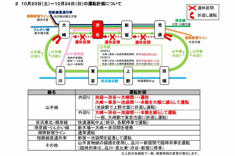 山手線内回り、23日から2日間運休。外回りも本数減少