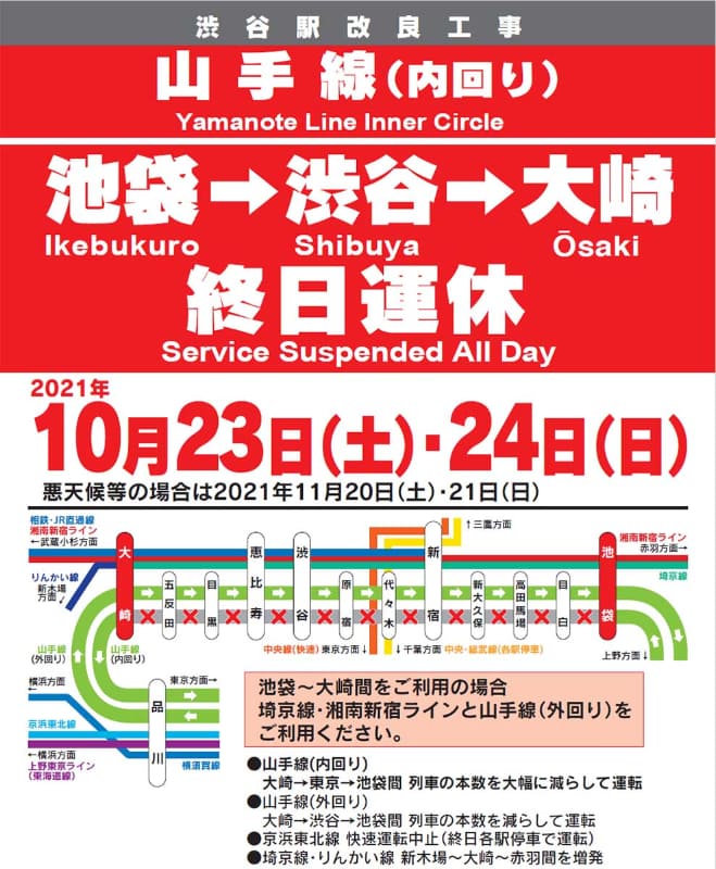 山手線内回り、明日から2日間運休。外回りも本数減少