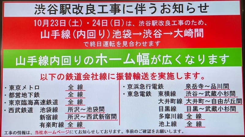 山手線内回り、明日から2日間運休。外回りも本数減少