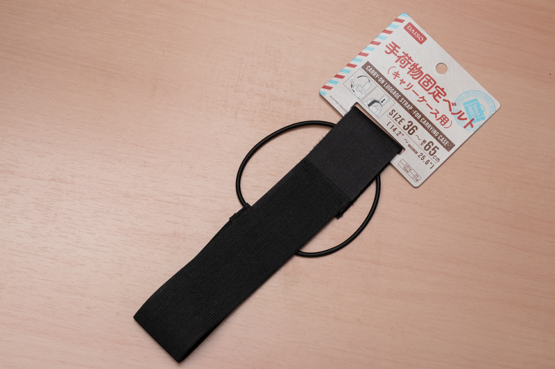 100均の「手荷物固定ベルト」が便利。キャリーケースに載せたバッグを固定