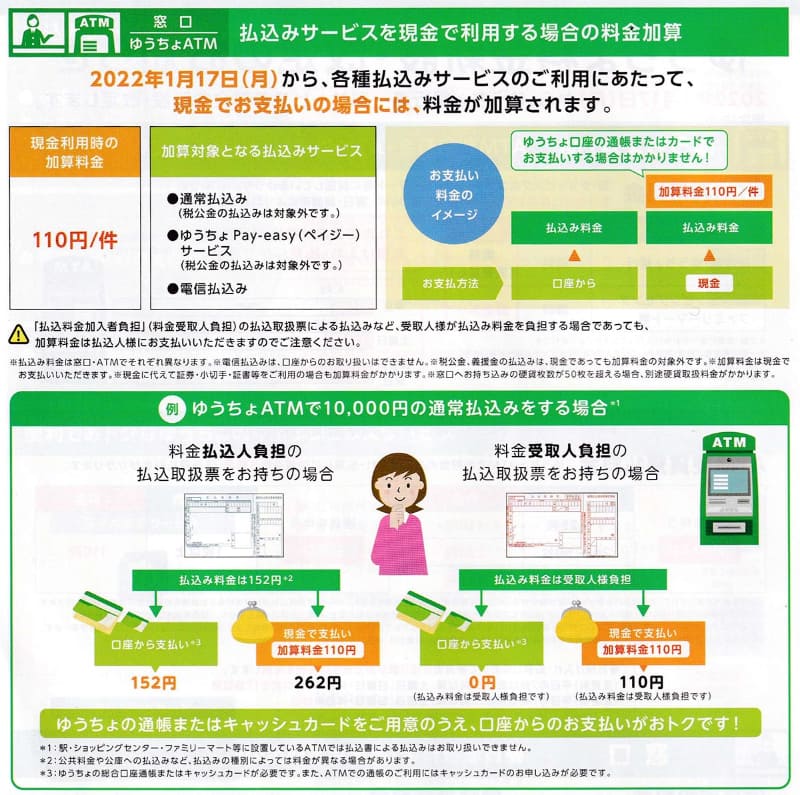 • ゆうちょ銀行、現金を使った支払いで手数料110円。22年1月から