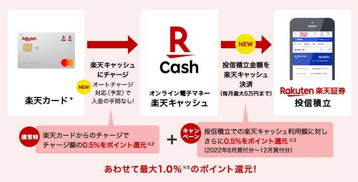 楽天証券、楽天キャッシュで投信積立に対応。楽天カードチャージで0.5%還元