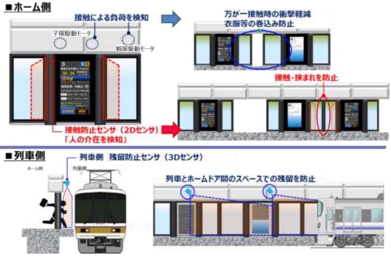 • 世界初、車両に応じて開口位置が変わるホームドア。JR西日本