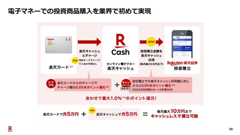 • 楽天証券、楽天キャッシュで投信積立に対応。楽天カードチャージで0.5%還元