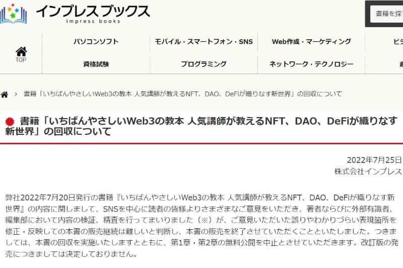 インプレス、書籍「いちばんやさしいWeb3の教本」回収