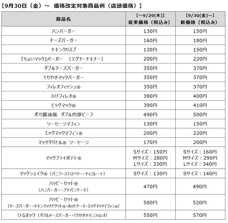 マック値上げ ハンバーガーやてりやきバーガーなど