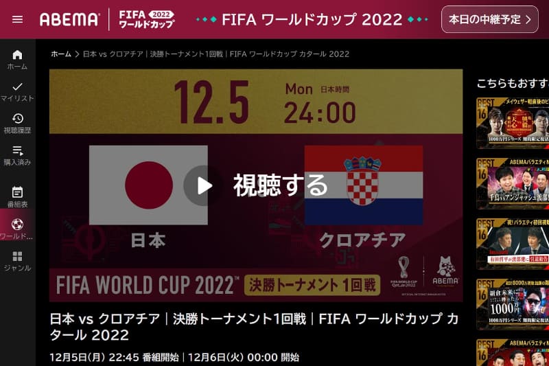 • ABEMA、5日深夜の「日本vsクロアチア戦」で“入場制限”の可能性