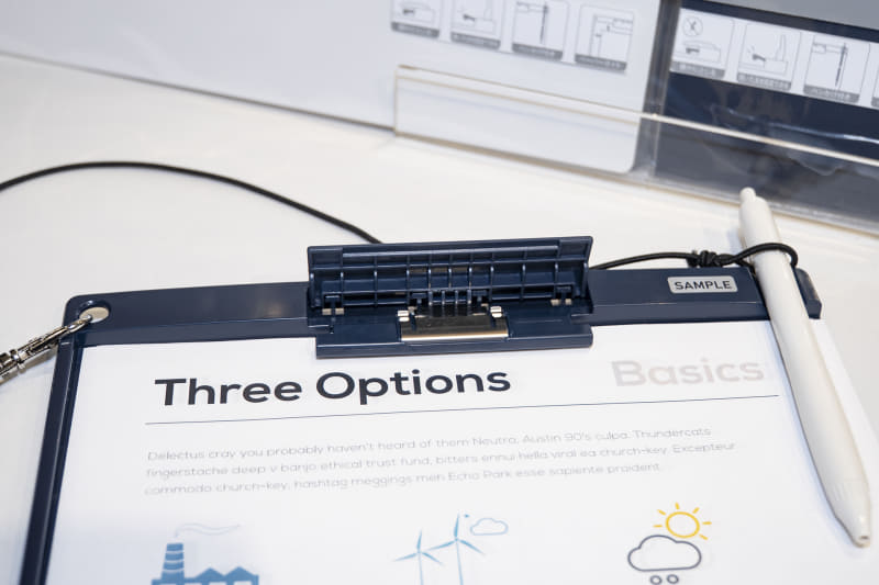 • キングジム、ホチキス留め感覚で紙をめくれる書類ホルダー「ナナメクリ」
