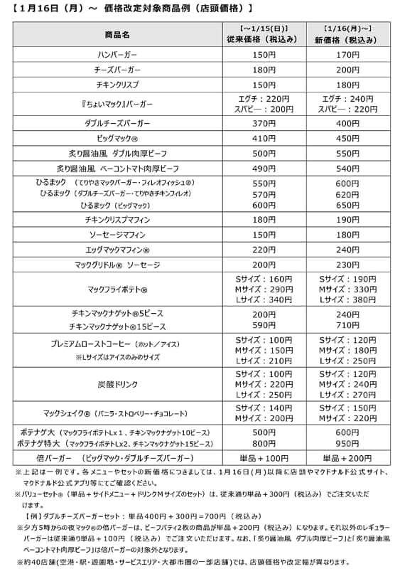 マック値上げ。ハンバーガー150円、ビッグマック410円