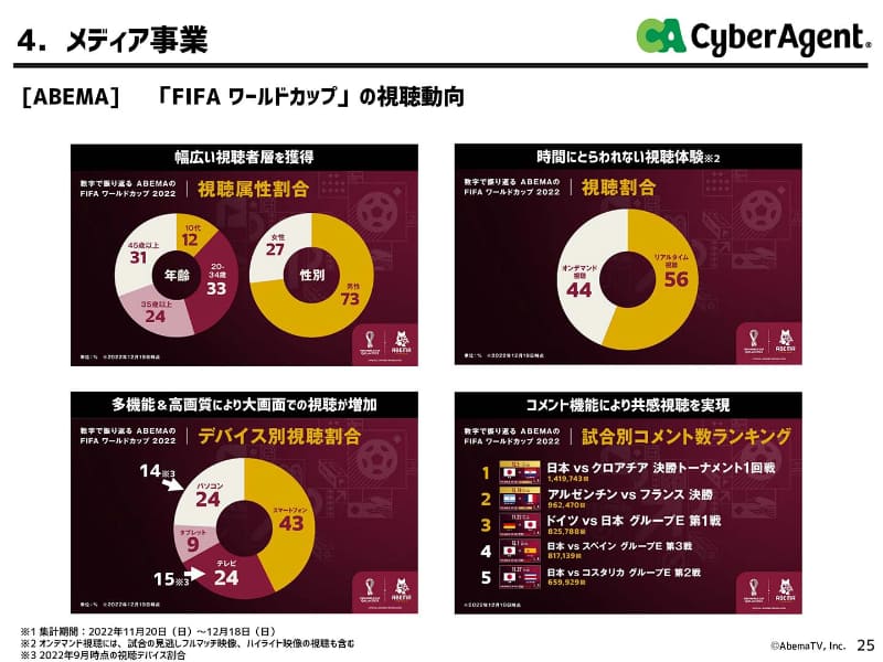 • ABEMAのW杯、ライブ視聴が56% テレビの大画面が人気
