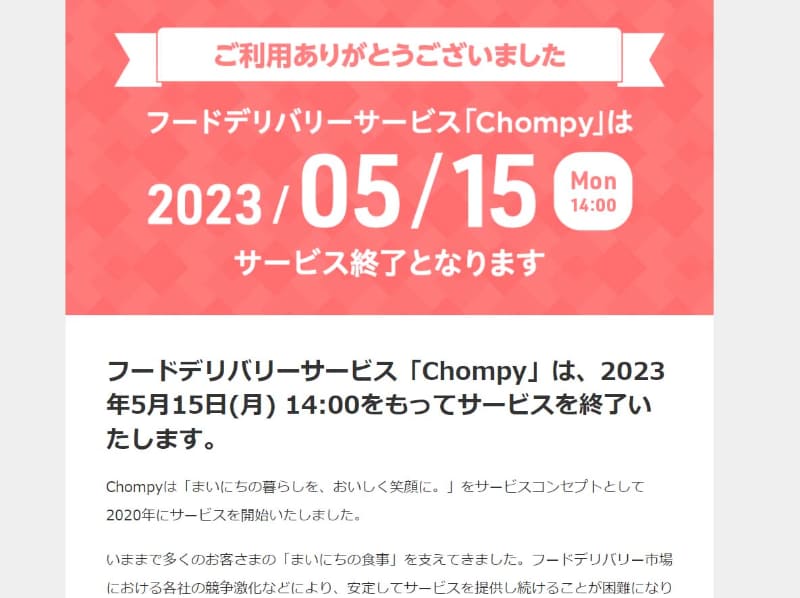 フードデリバリー「Chompy」5月15日終了 競争激化のため