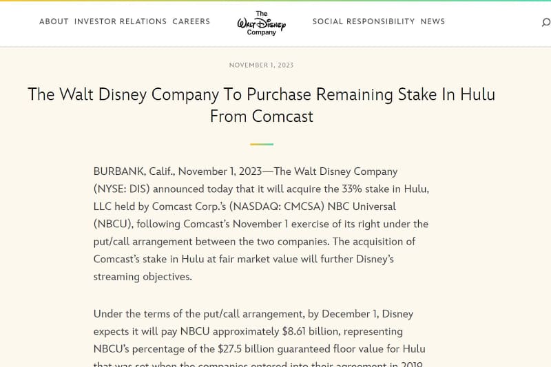 米DisneyがHuluを取得へ。Comcastからの株式譲渡で継承