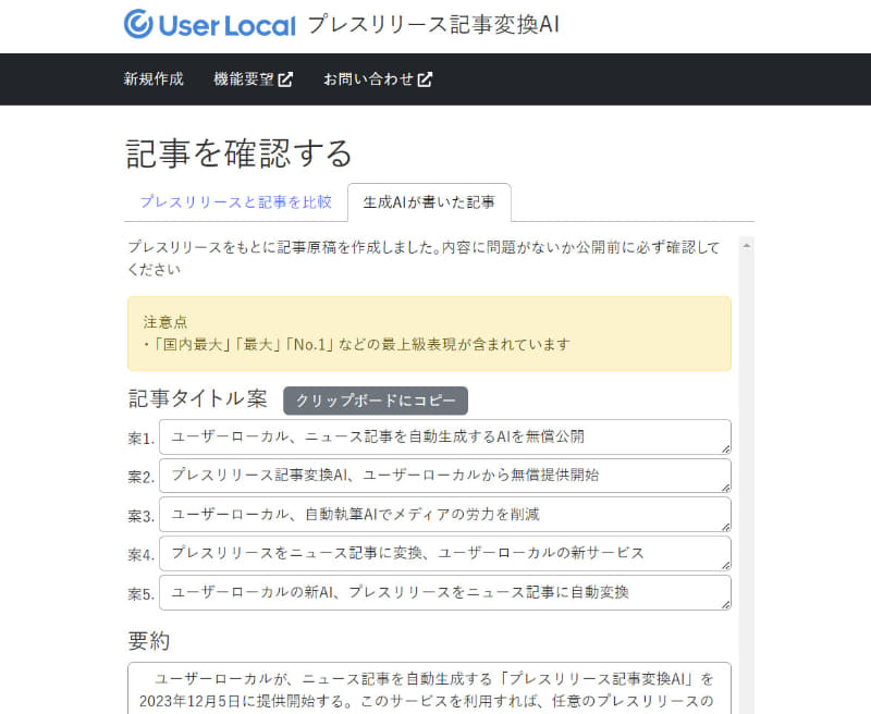 ニュース記事を自動執筆する「プレスリリース記事変換AI」