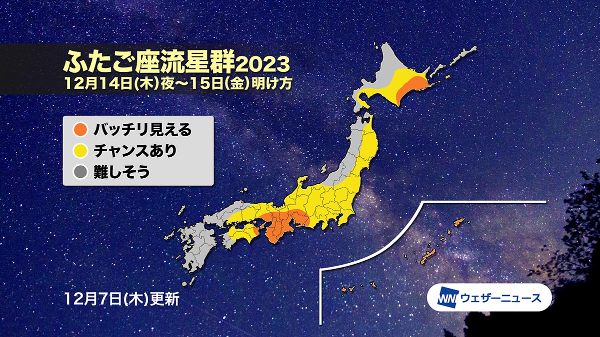 ふたご座流星群、14日22時に極大 太平洋側は晴れて好条件