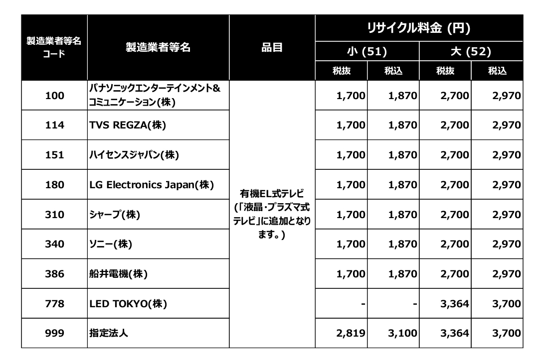 ハイセンス、家電リサイクル券料金変更。TVは1,870円から