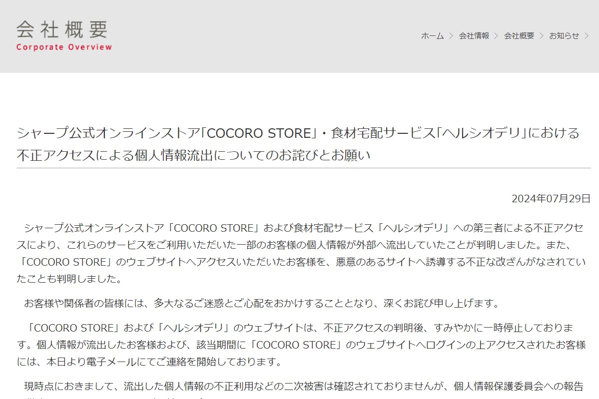 シャープ、公式EC「COCORO STORE」で不正アクセス 203件の個人情報流出