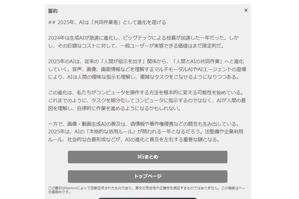 「Gemini」を使った「AI記事要約」を開始しました
