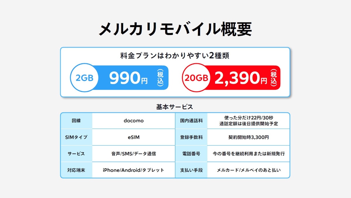 • メルカリモバイル、4GB 990円など選べる4つの料金プラン 物理SIMも
