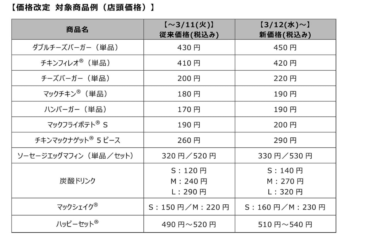 マック値上げ ハンバーガー170円、ダブチ400円