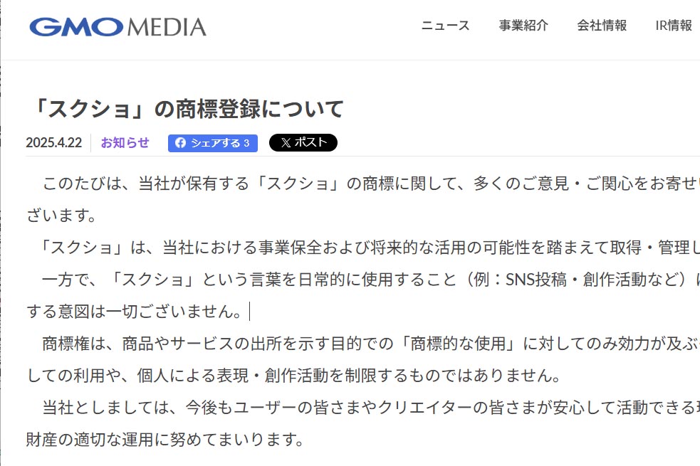 「スクショ」商標登録でGMOメディアが声明 日常利用で行使は「一切ない」
