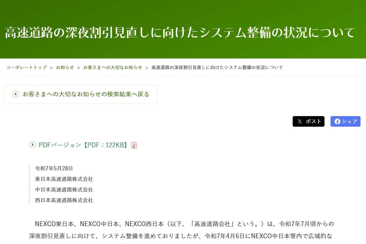 高速道路の深夜割引見直し、25年7月に延期 システム整備に遅れ