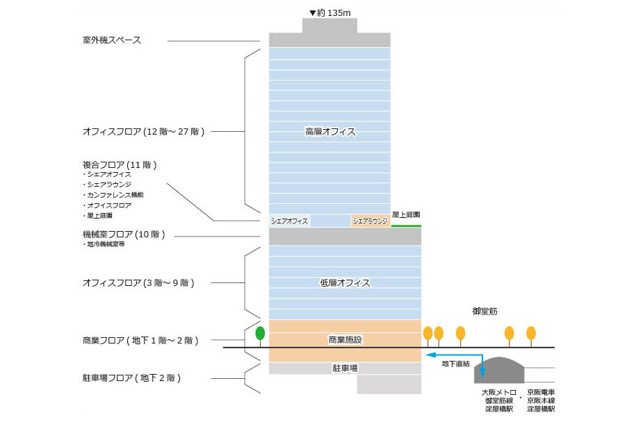 • 御堂筋に高さ135m、広さ1.7haの複合施設。淀屋橋駅直結