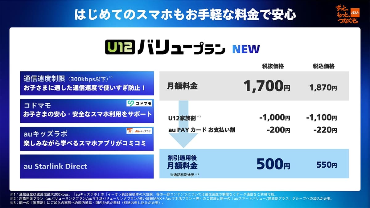 auから3つの新料金プラン 12歳以下は学習+300kbps、60歳以上は電話+金利(4/9)