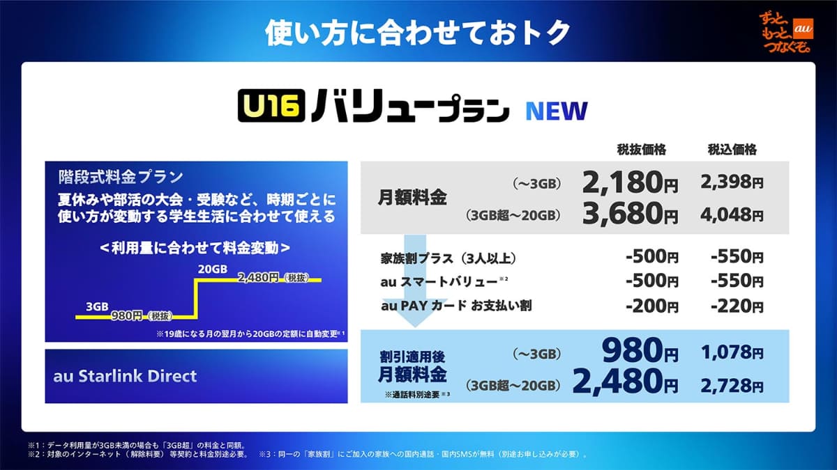 auから3つの新料金プラン 12歳以下は学習+300kbps、60歳以上は電話+金利(6/9)