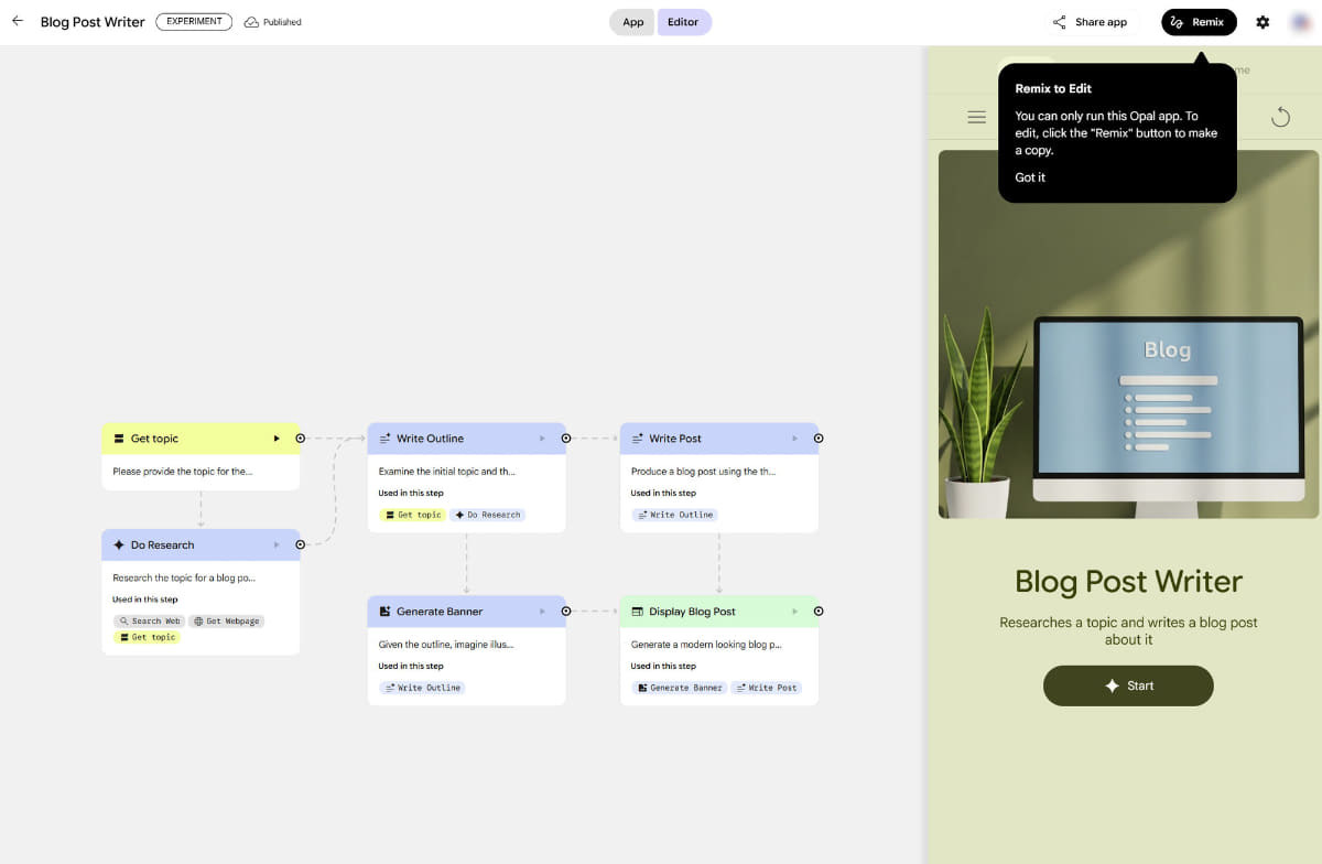 グーグル、AIミニアプリをノーコードで作成できる「Opal」