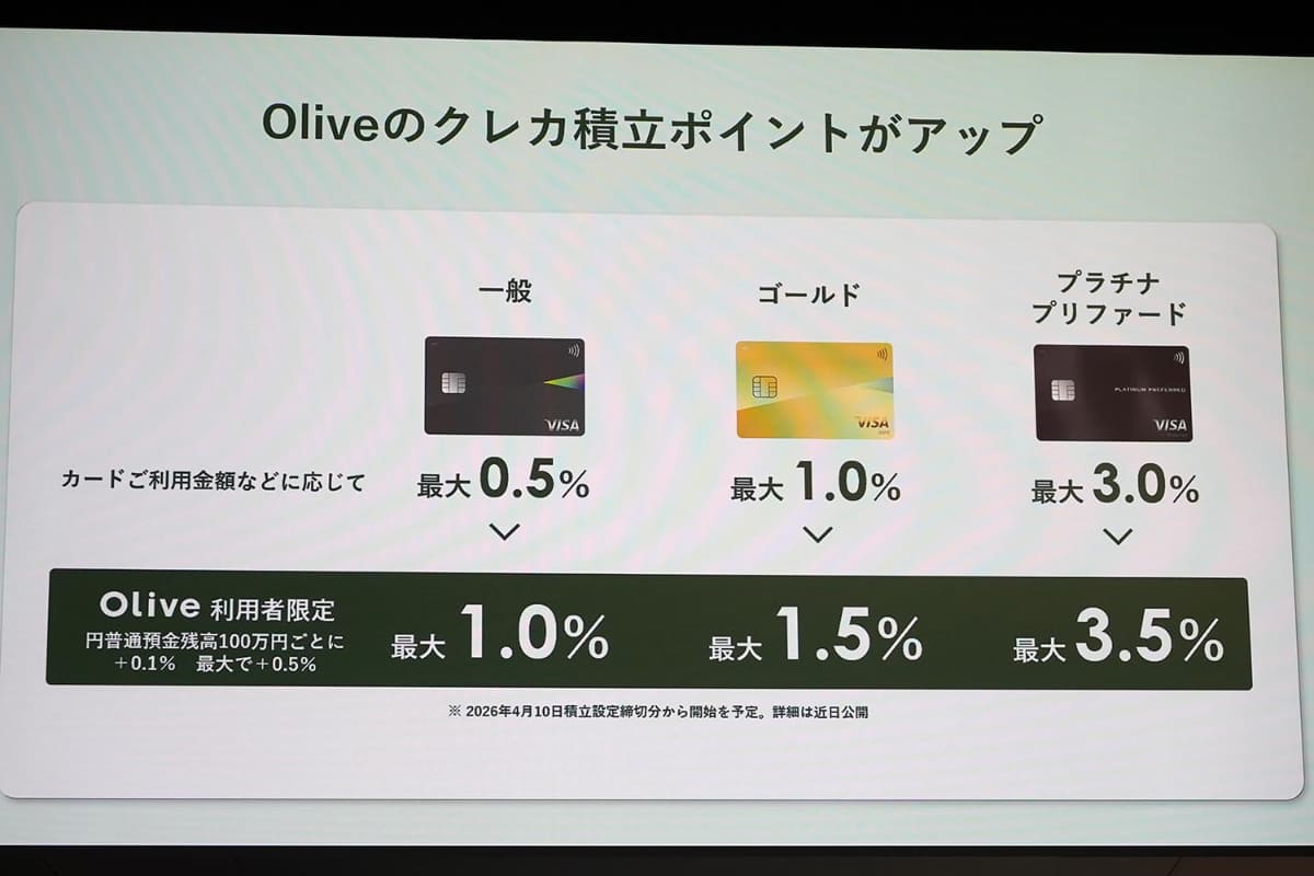 • Olive、預金残高100万円以上でクレカ積立ポイントアップ 最大0.5%