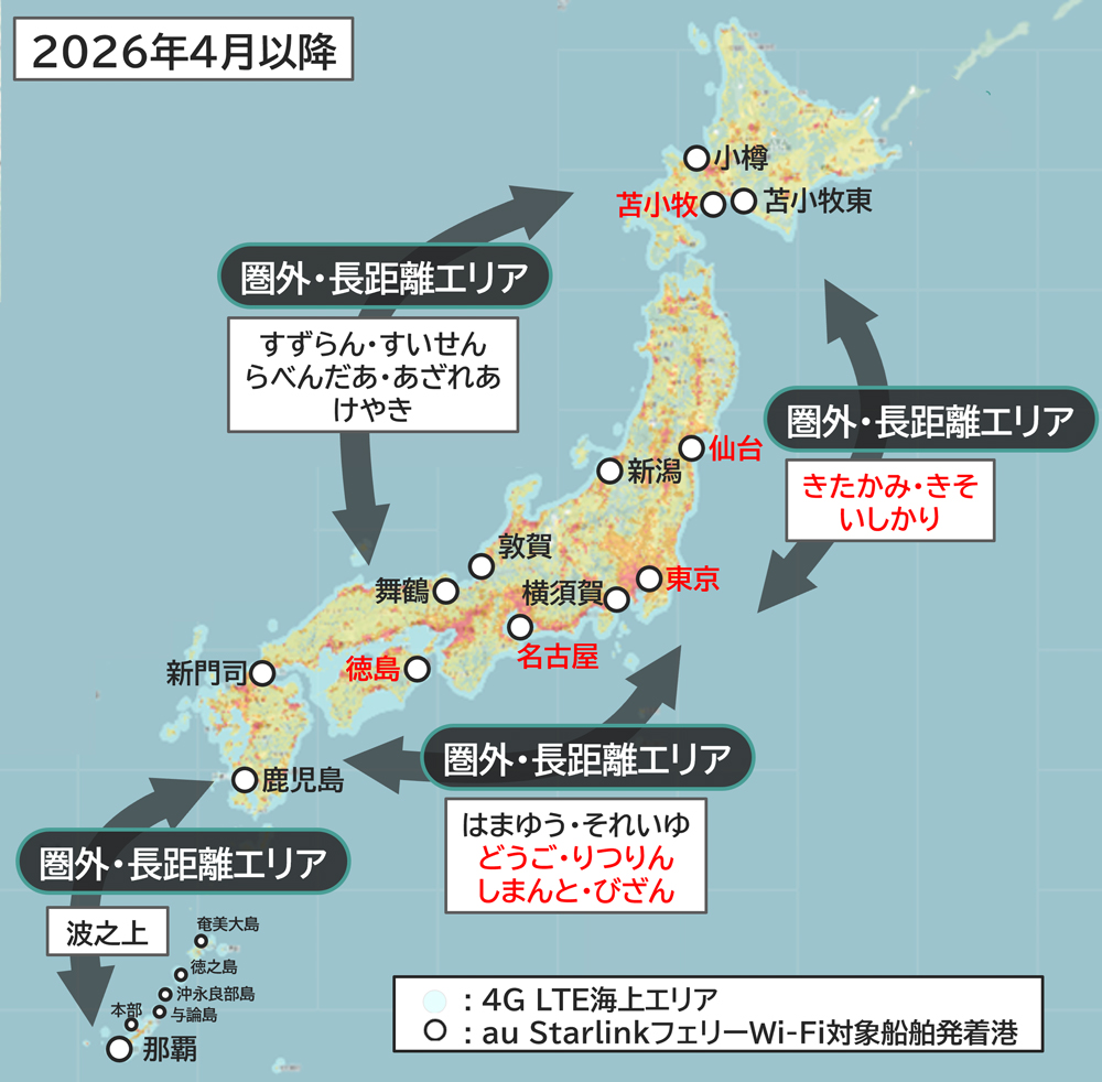 au Starlink Direct、領海外でも通信可能に 国内接続エリア2倍