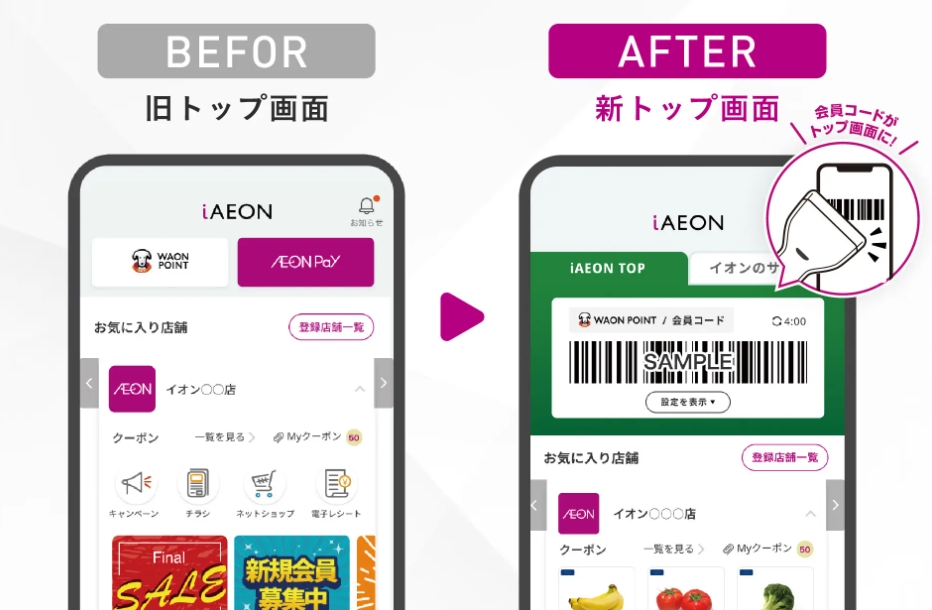 iAEONリニューアル、トップ画面に会員コード常時表示