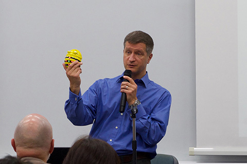 メインスピーカーは、Bee-Bot(ビーボット)をはじめとする教育用プログラミングロボットの開発販売を手がけるイギリスのTTS社でカリキュラムスペシャリストを務めるアンドリュー・ブッシュ氏。元小学校教師で、その後、先生のトレーニングをするアドバイザーも経験しており、現場の空気を知っている経歴の持ち主だ。