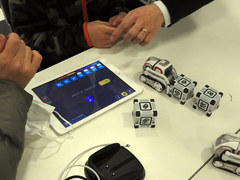 タカラトミーの「COZMO(コズモ)」は、プログラミングをしなくてもさまざまな自律動作を行える人工知能搭載ロボットだが、タブレットに専用アプリをダウンロードすることで、ブロックを用いたプログラミングが可能になる。COZMOの動きやLEDの制御などを自由に行うことができ、付属のキューブを動作のきっかけとして使ったり、笑顔やしかめ面を認識してアクションを行うこともできる。