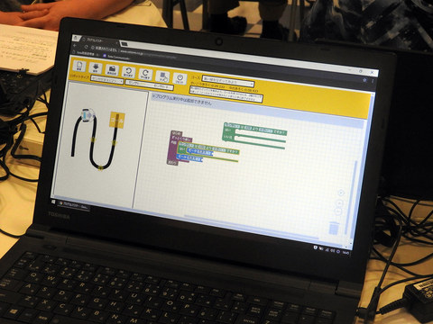 ヴイストンは、仮想ロボットをブロックによってプログラミングする「プログラムマスター」の体験デモを行っていた。こちらもWebアプリとして動作し、無料で利用できる。Scratchなどに似たブロックプログラミング環境だが、仮想ロボットをプログラミングで動かすようになっていることが特徴だ。